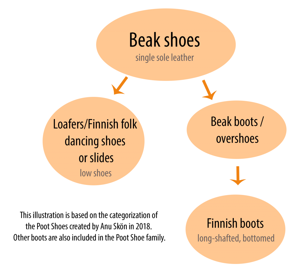 There are a number of traditional handmade footwear in Finland, such as birch-bark shoe, Finnish boots (lapikas) and loafers/Finnish folk dancing shoes (supikas). The terms beak shoe (pieksu), loafer/Finnish folk dancing shoe (supikas) and Finnish boot (lapikas) have previously been used interchangeably. Because of the same type of model, they can all be considered to belong to the Poot Shoe family family. The beak shoe (pieksu) differs from the Finnish boot in that it has only one sole leather, which also forms the flanks of the boot. The current concept is that they are considered as Finnish boots when the bottoms are sewn underneath. Low shoes are called loafers/Finnish folk dancing shoes (supikas) or slides.